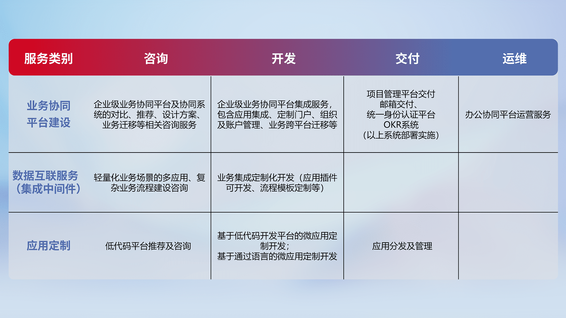 针对钉钉、、企微、、、、IDaas等平台级产品提供产品的规划、、、、方案、、、、交付、、、定制化开发等服务,,,实现如统一协同办公、、、智能客户服务、、、、混合会议管理、、、、智能数据查询、、等业务场景,,,,实现数字化转型。。