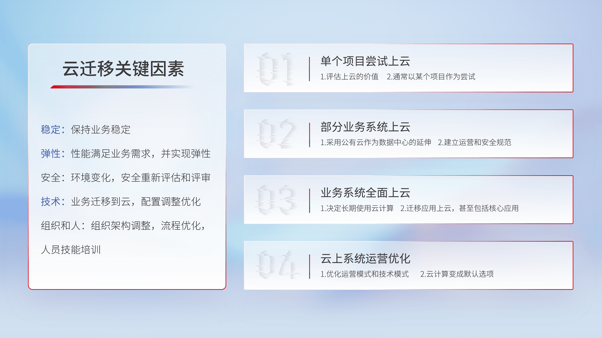 结合实际业务,,,,从规划设计、、、云平台选型、、、云原生改造、、数据迁移、、集成交付,,迁移全过程为客户识别最佳上云路径,,,做好风险识别管理,,,,设计网络架构、、身份权限、、安全审计合规、、操作审计、、、日志审计、、、、监控告警策略、、、多站点容灾设计等,,,,对云上基础设施进行整体规划,,,,提升IT治理水平,,,,以满足弹性、、、高可用、、、高性能的需求。。。。