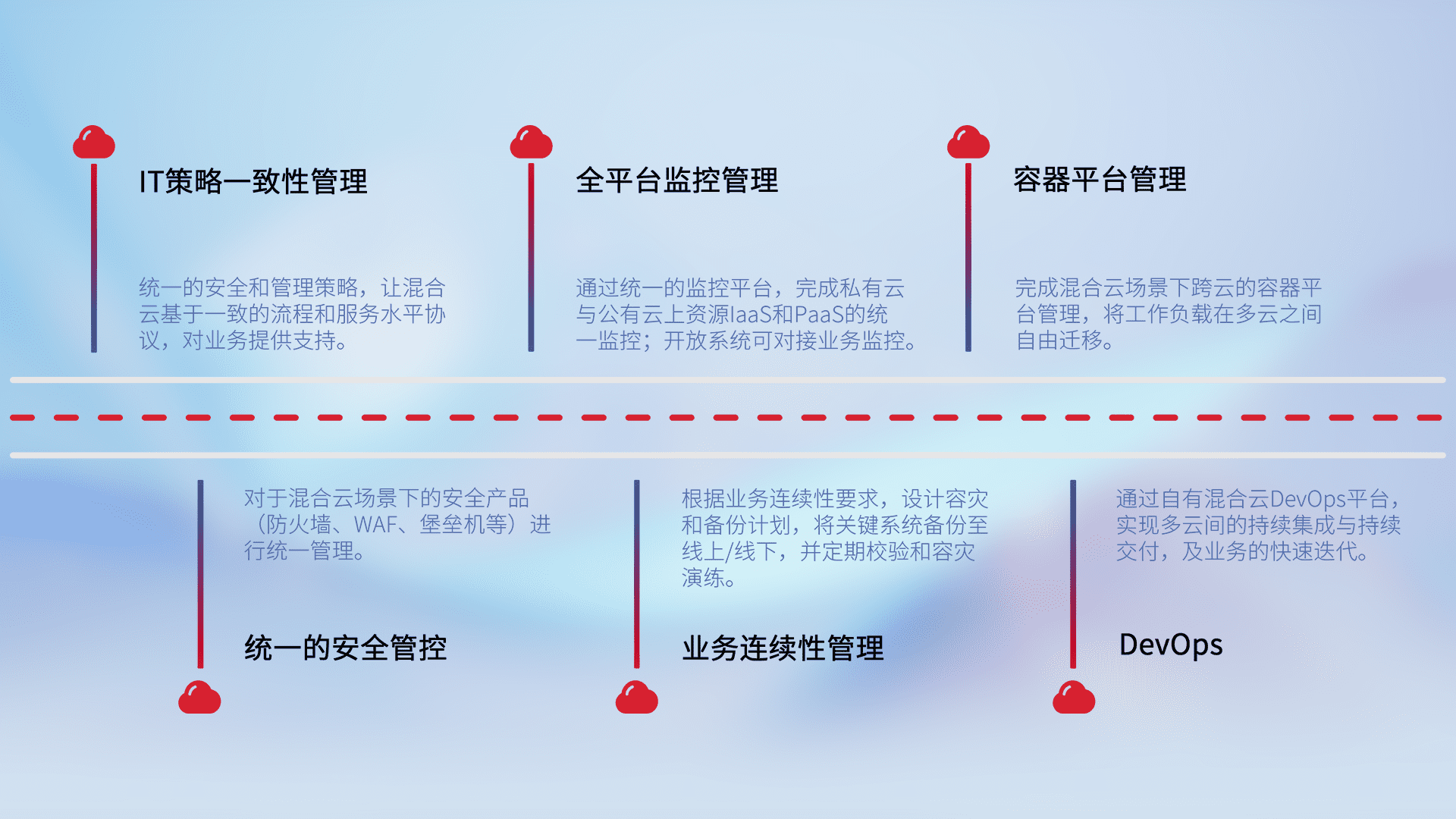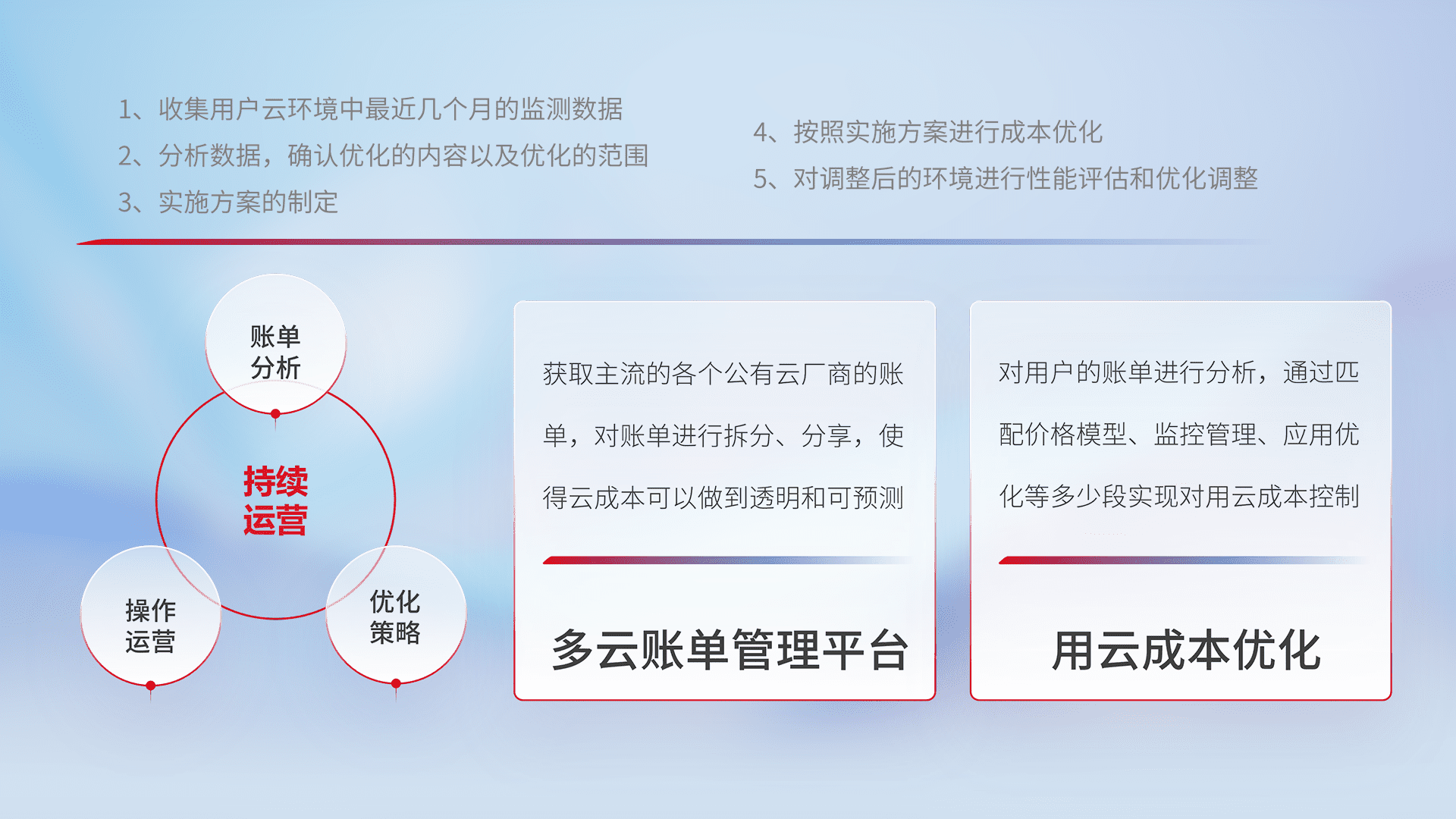 通过多云纳管,,以统一的资源数据模型把客户的云资源进行抽象和封装,,,进而实现对多云资源的统一操作,,保障云资源管理的可靠性、、、稳定性与可用性。。量身定制化运维内容,,,配置、、、、开发运维、、补丁管理、、、、备份、、、、监控、、、、认证和访问管理、、、、审计和日常巡检等,,,保障在用云过程中的可靠度,,,,稳定度以及高可用率。。。