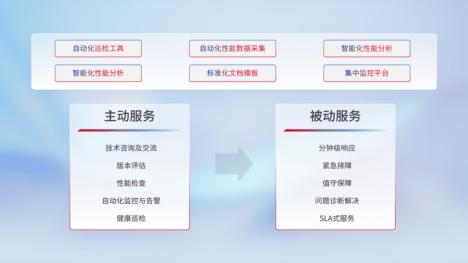 智能化工具和标准化文档,,保障服务质量,,提供主动服务(包含技术咨询、、、、版本评估、、性能检查、、、自动化监控与告警、、健康巡检)和被动服务包含(分钟级响应、、、紧急排障、、、值守保障、、问题诊断解决、、、、SLA服务)。。。