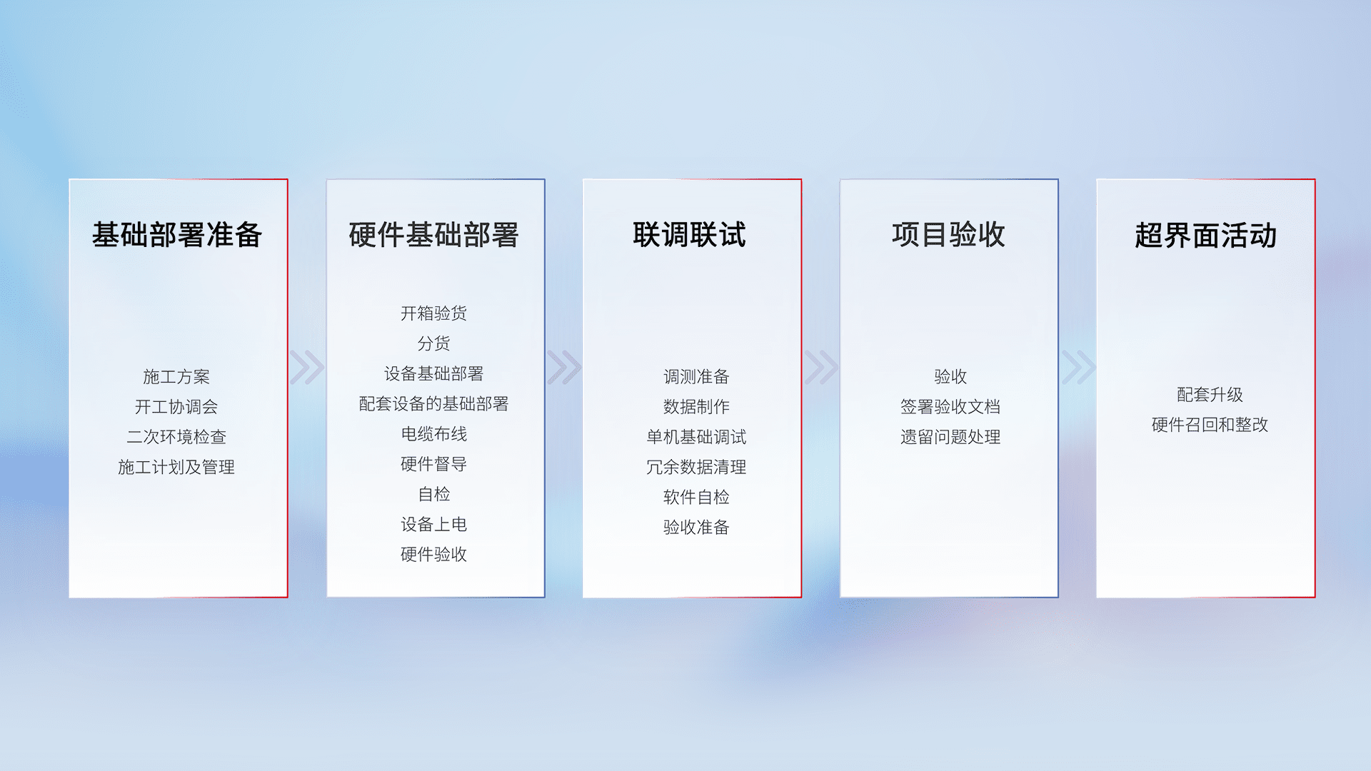 从基础部署准备、、、、硬件基础部署、、联调联试、、、、项目验收、、、、越界面活动的全过程可追溯,,,,保证施工质量和进度。。。。